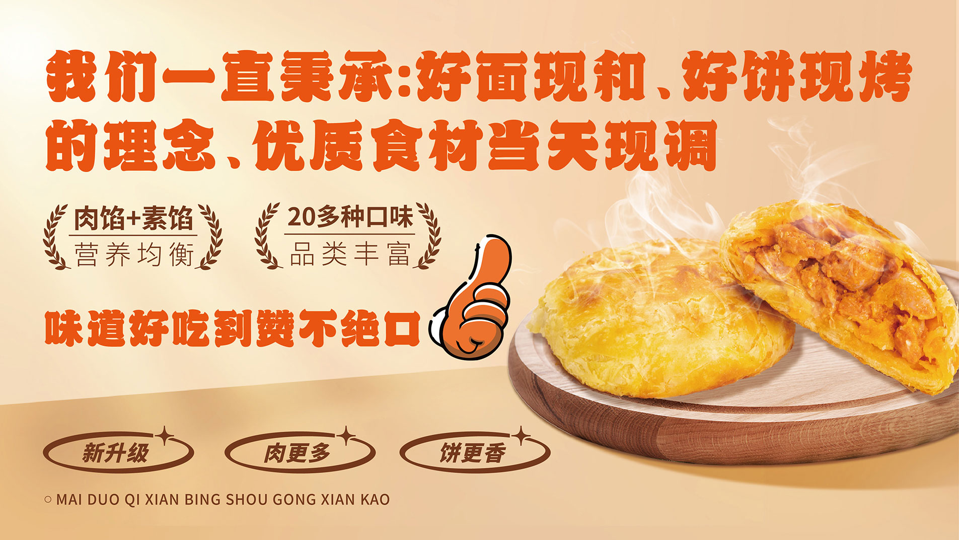 今年我們河南麥多餡餅食品有限公司推出了新產(chǎn)品:“麥多奇鮮肉餅”。我們新出的麥多奇鮮肉餅采用整店明廚亮灶、一條條前腿肉掛在窗口處,一袋袋高筋面粉擺在案板上,店內(nèi)工作人員現(xiàn)場制作,純手工和面、調(diào)餡,一個餅使用一兩肉……